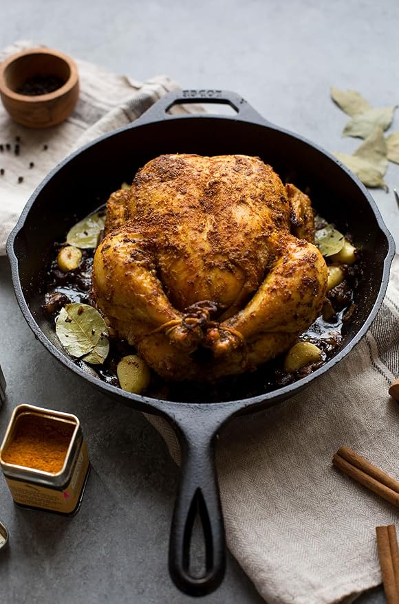 - 12 INCH CAST IRON SKILLET. This seasoned skillet is ready to use and is extremely versatile. It has a 12 inch diameter and is 2 inches deep. The ergonomic design allows this skillet to be taken from the campfire or stovetop to the table, making it essential for every kitchen.