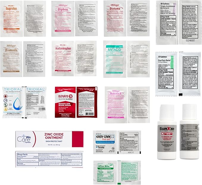 - Advanced Trauma Supplies: Includes a CPR mask with O2 valve, C-Splint, trauma pads, and a variety of medications for your camping essentials, first aid supplies, or survival kit