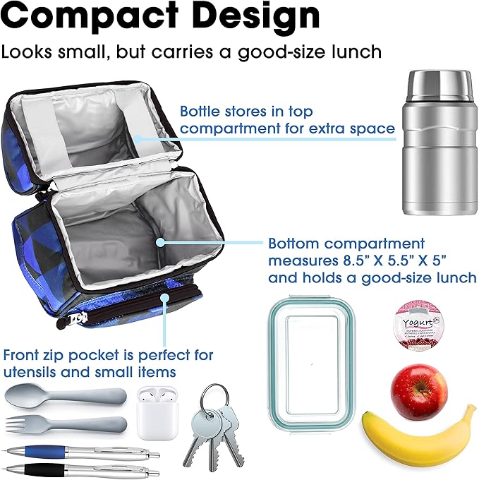 - Bottle In Top — Your drink bottle secures in the top to keep it from squishing your sandwiches. Front pocket of this compartment lunch bag is perfect for carrying condiments