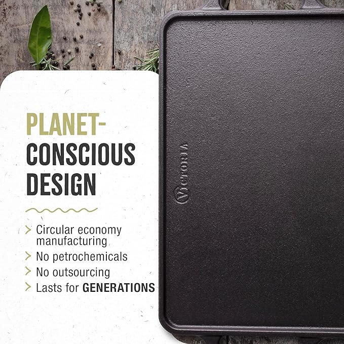 Victoria Rectangular Cast Iron Griddle. Double Burner Griddle, Reversible Griddle Grill, 13 x 8.5 Inch, Seasoned with 100% Kosher Certified Non-GMO Flaxseed Oil, Model: GDL-189