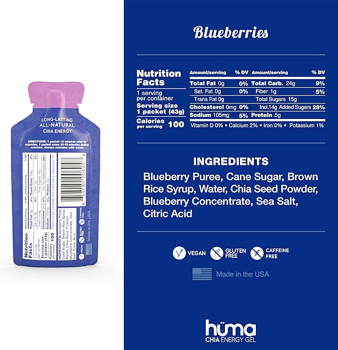 Huma Chia Energy Gel, Blueberries, 12 Gels - Premier Sports Nutrition for Endurance Exercise