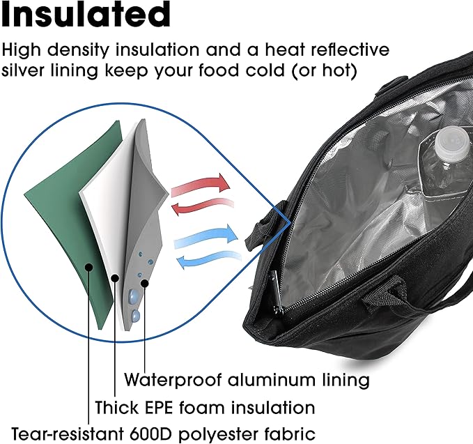 - Insulated — High density insulation and a heat reflective silver lining keeps your food cold (or hot) in this thermal lunch bag