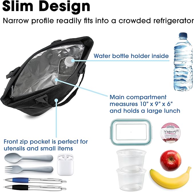 - Fits In Fridge — The narrow profile of this slim lunch box readily fits into a crowded refrigerator at work. For a wider lunch tote, search for “J World New York Casey" or "J World New York Cara"