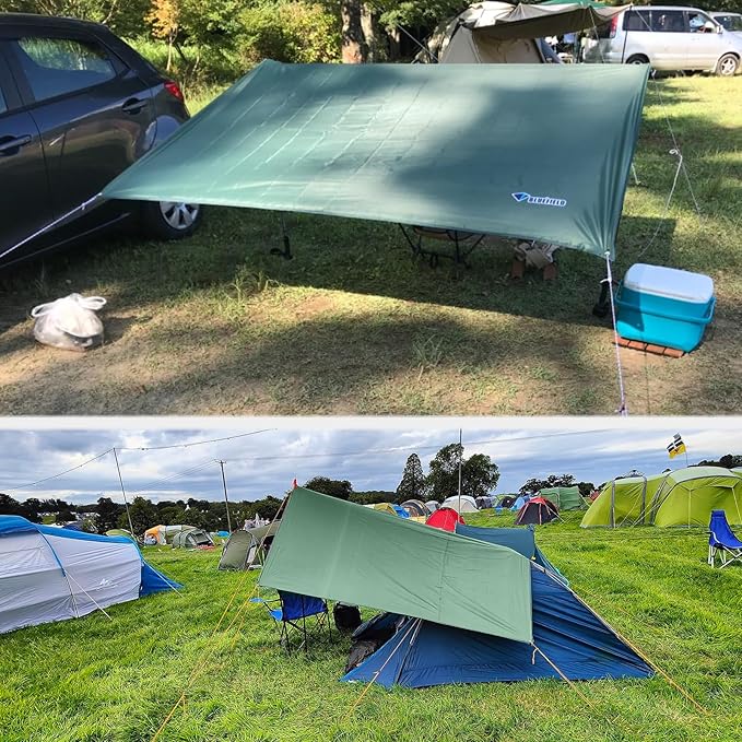 - ✅ EXTENSIVE APPLICATION -- The ultralight rain tarp can also play the role as Tent Shelter, Backpacking Tarp, Floor tarp, Rain Shelter, Hunting Tarp, is super ideal for Camping, Hiking, Picnic, Cycling, Backpacking