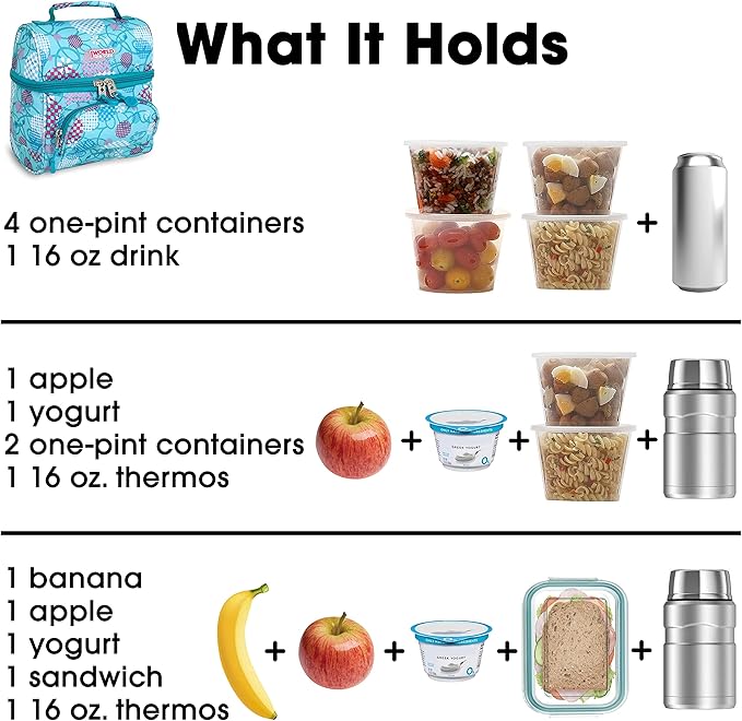 - What It Holds — Insulated lunch box holds a 12-16 oz drink, a yogurt cup, a fruit cup, a small cottage cheese container, an apple, and 2 frozen gel packs
