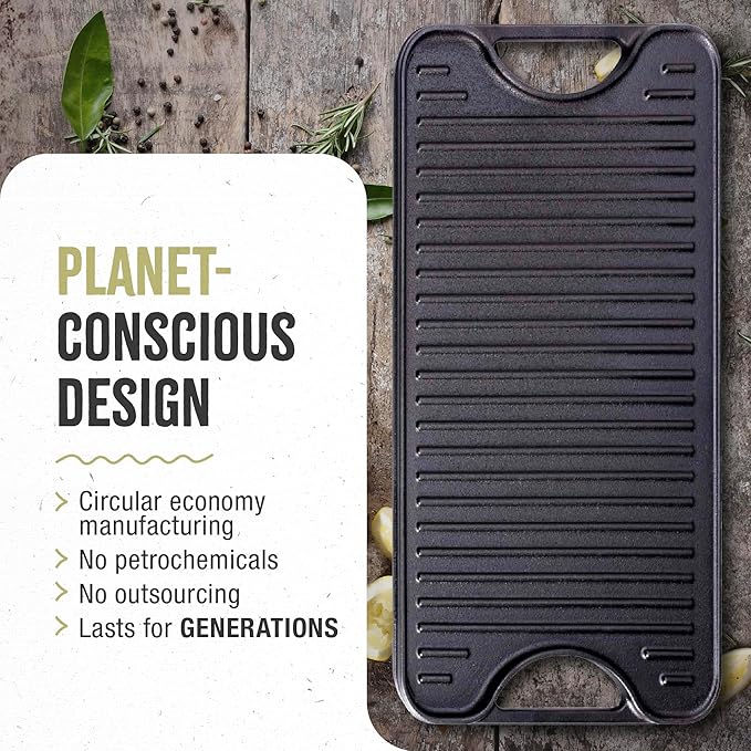 Victoria Rectangular Cast Iron Griddle. Double Burner Griddle, Reversible Griddle Grill, 18.5 x 10 Inch, Seasoned with 100% Kosher Certified Non-GMO Flaxseed Oil