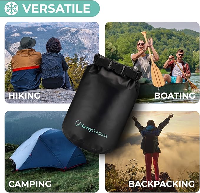 - COMES IN MANY VARIATIONS: Savvy Outdoors waterproof bag for kayaking, camping, and other outdoor trips is a stylish storage solution for your valuables like cellphones, food, and cash. We offer them in 4 sizes from 5 to 30 liters to suit your needs. There are also 5 colors you can choose from.