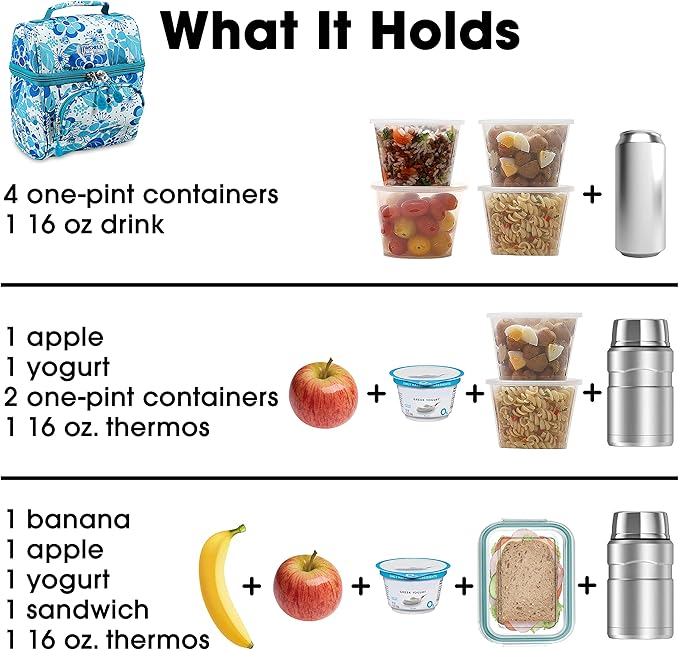 - What It Holds — Insulated lunch box holds a 12-16 oz drink, a yogurt cup, a fruit cup, a small cottage cheese container, an apple, and 2 frozen gel packs