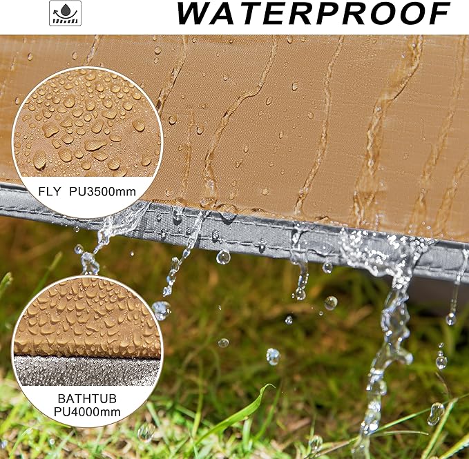 - Waterproof Tent:With a PU 3500mm rainfly and poly oxford 300D 4000mm water resistance on the bathtub floor, backpacking tent offers excellent waterproof performance to meet any condition. Seam taping on the zipper, velcro wrap with PVC & seam taping, and 4 bottom corners with seam taping provide added protection against rain and moisture. Plus, 3 person tent meets CPA1-84 fire retardant standard and UPF 45+ for enhanced safety.