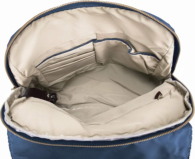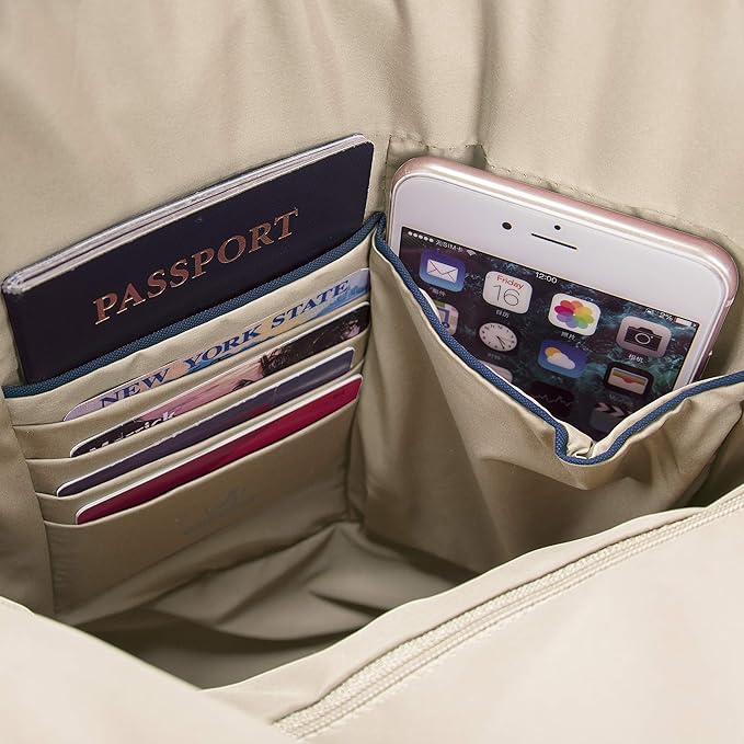• Double locking zippered main compartment has 5 RFID blocking card slots, a passport slot, 2 zippered wall pockets and a drop pocket for glasses or other quick grab items, Main compartment is large enough to fit a tablet