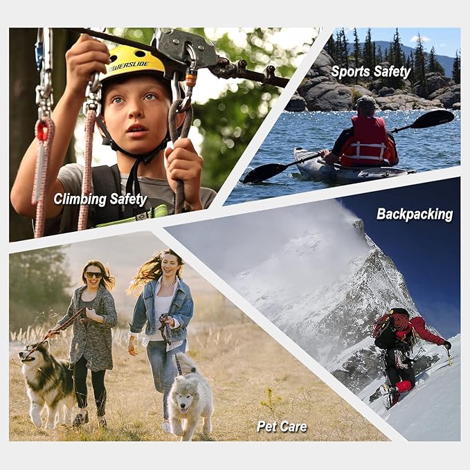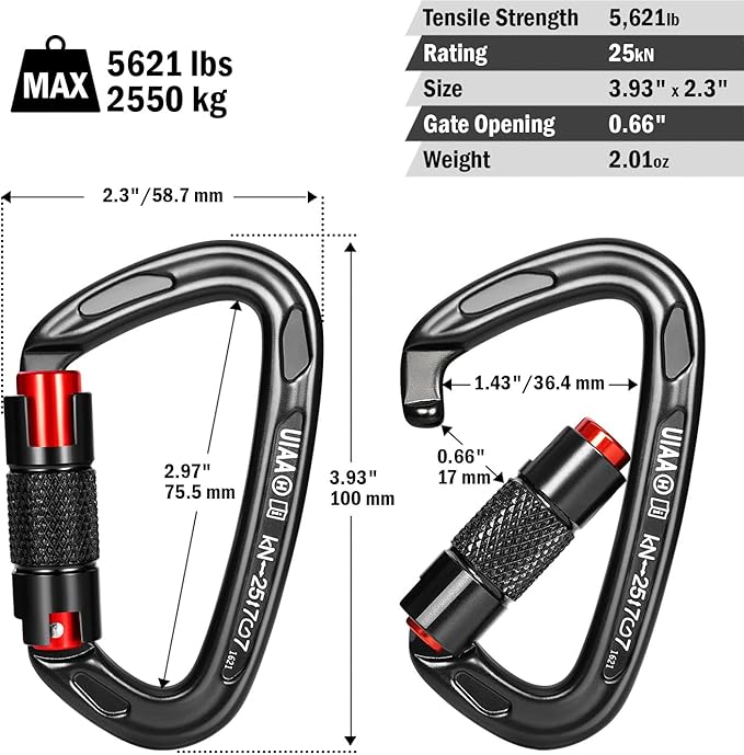 - 【TWIST LOCK】- 25KN twist-lock carabiner, instantly lock and one hand to open, 2-way locking, a simple twist the barrel and push against the spring load will open. Automatic re-locking when releasing the pressure.