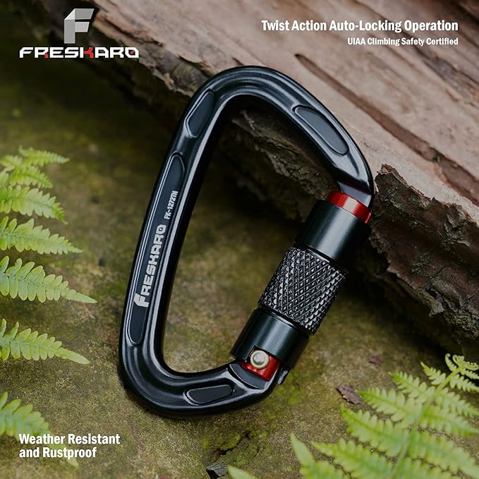 FresKaro UIAA Certified 25KN Auto Locking Climbing Carabiner Clips, Twist Lock, and Heavy Duty Carabiners for Rock Climbing, Rappelling, and Mountaineering, D Shaped 3.93 Inch, Large Size, Black