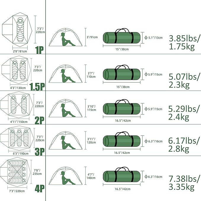 - LARGE SIZE & LIGHTWEIGHT: Ultralight 2 person tent! Tent's size 7'3''x 4'11''x 3'10''(220x150x115 cm). Weighing just 5.29lbs (2.4 kg) total, or 4.52 lbs (2.05 kg) at minimum trail weight (fly, inner tent, poles only), greatly reducing your load. The compact 16.5''x5.9''x5.9'' (42x15x15 cm) packed size slips easily into backpacks, making it ideal for family hikes, boy scout trips, or adventures with your furry friend