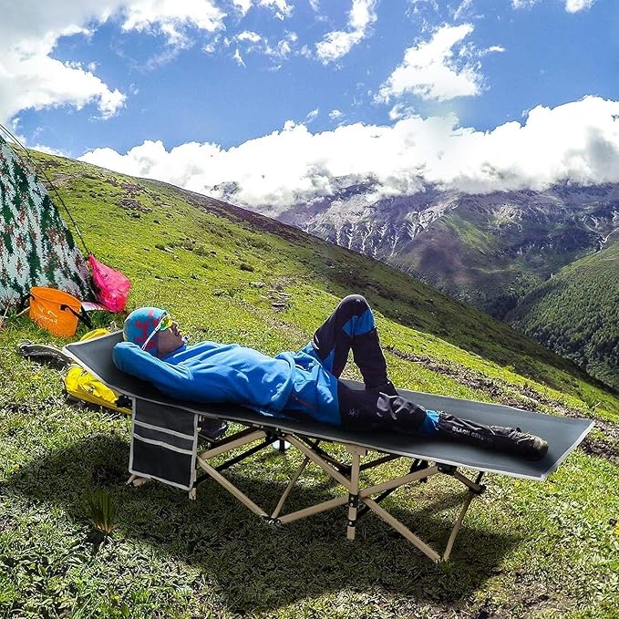 - Space-saving camping cot: Our folding camping bed can be folded into a compact packing size, easy to carry and store in the house or trunk whenever you want to go camping/sunbathing outside