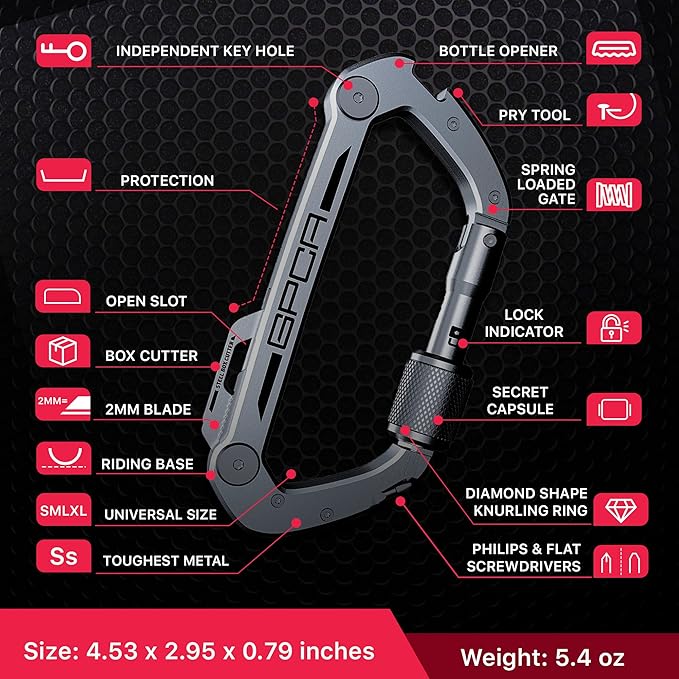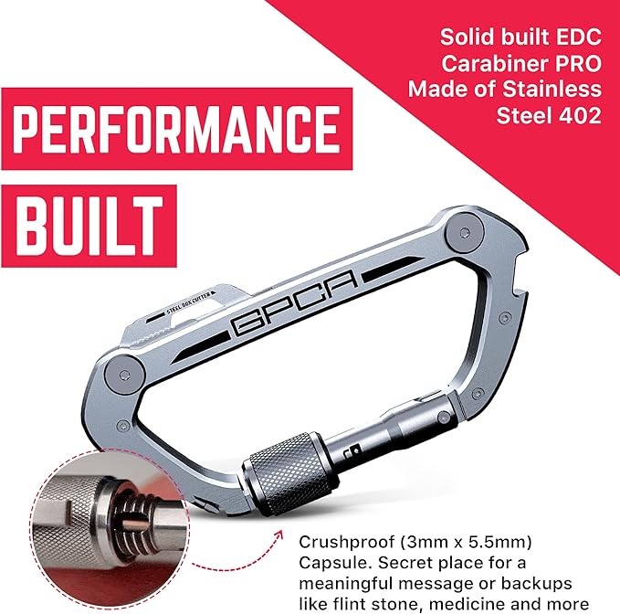 - PREMIUM GRADE MATERIALS: GPCA Carabiner Keychain Clip is known for its strength and durability. It serves as a reliable travel accessory, perfect for outdoor adventures. With a high load-bearing capacity, our carabiner keychain clip is not just for keys. It can handle heavier items like tools, flashlights, or even small bags, making it a versatile tool for any situation.