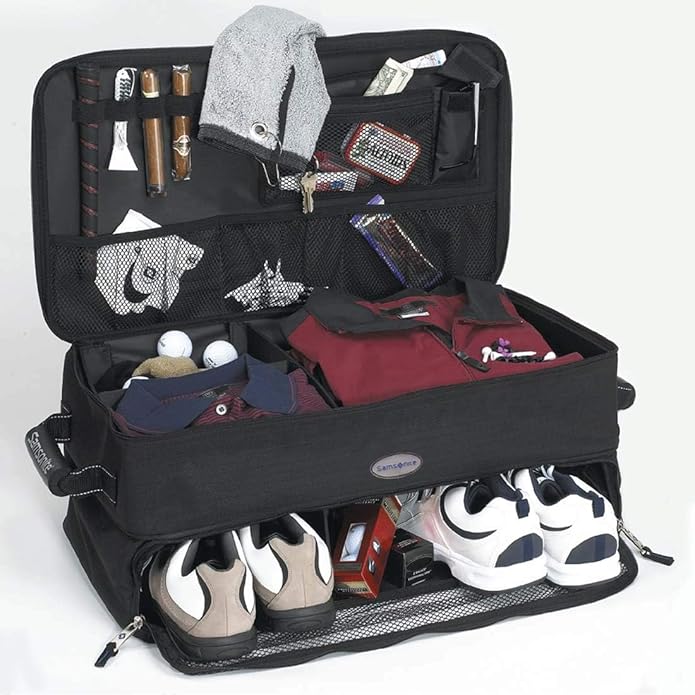 • The Trunk Organizers bottom level holds multiple pairs of shoes with compartment dividers
