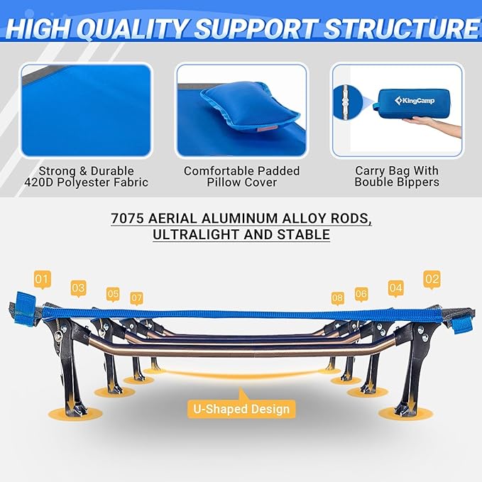 KingCamp Camping Cots for Adults Outdoors Backpacking,Folding Ultralight Heavy Duty Sleeping Cots Compact Portable Cot for Travel Hiking,Indoor Base Camping Bed with Storage Bag and Pillow, Blue