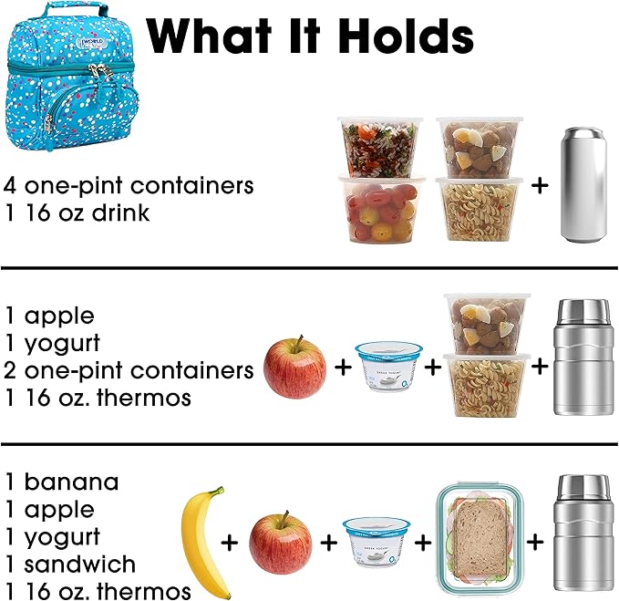 - What It Holds — Insulated lunch box holds a 12-16 oz drink, a yogurt cup, a fruit cup, a small cottage cheese container, an apple, and 2 frozen gel packs