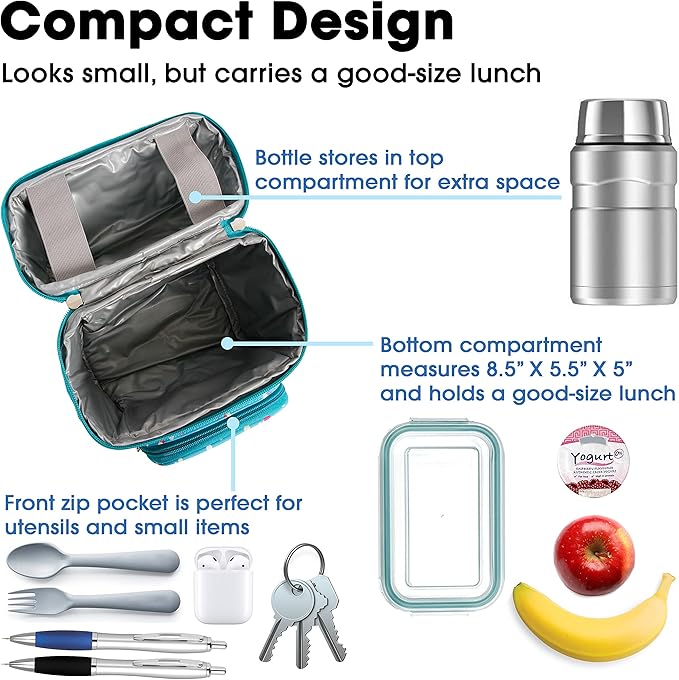 - Bottle In Top — Your drink bottle secures in the top to keep it from squishing your sandwiches. Front pocket of this compartment lunch bag is perfect for carrying condiments