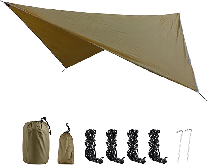 - ✅ EXTENSIVE APPLICATIONS -- The lightweight rain tarp can also play the role as Tent Shelter, Backpacking Tarp, Floor tarp, Rain Shelter, ideal for Camping, Hiking, Picnic, Cycling, Backpacking