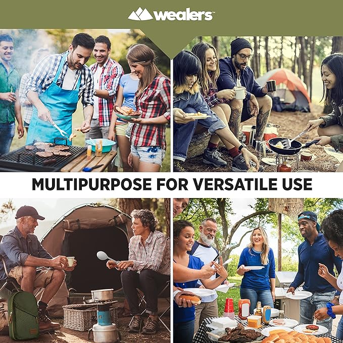 - MULTIPURPOSE: The trendy kit can be used for multiple applications, perfect for concerts, sporting events, hiking, boat rides, mountaineering and BBQ’s. The weather retardant the travel utensil kit is the perfect camp kitchen accessory, and it holds all your essential outdoor cooking utensils.