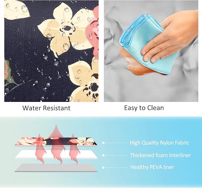 - Durable Structure -- (1)Exterior made of heavy duty Nylon fabric, water resistant & scratch resistant, and keep its shape well. (2)Interior is thick foam padding and soft PEVA insulated, preserve food cold or warm for 6 hours. (3)Top handle and side shoulder strap with reinforced stitching ensuring maximum durability. (4)PU leather Bottom with 4pcs feet makes this lunch bag stand alone by itself.