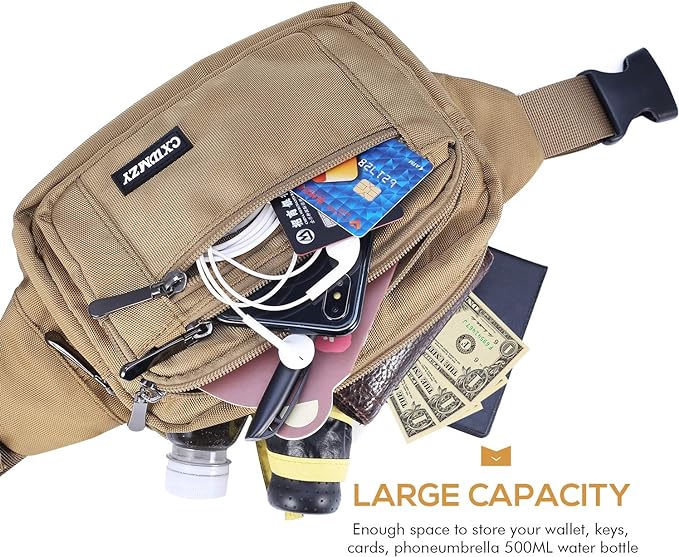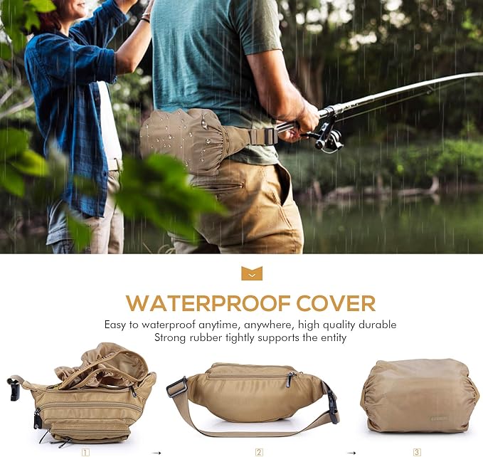 - 【6 MULTI-POCKET DESIGN】Our fanny packs for women & men will keep your hands & pockets free! 5 zipper pockets of different sizes and a hidden zipper pocket design, hidden zip perfect give your valuables extra security, all your needs. The largest pocket can easily accommodate a standard water bottle. A zippered exterior pocket located behind the waist band with Rain Cover it can better protect important items in rainy days.