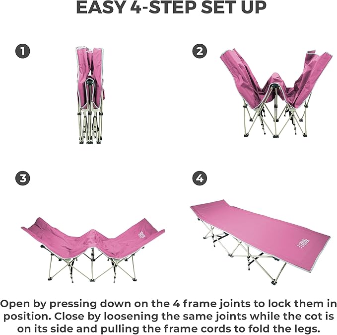 - EASY to SET UP and CARRY - Easy to use sleeping cots for adults; open by pressing down on the 4 frame joints to lock them in position; close by loosening the same joints while the cot is on its side and pulling the frame cords to fold the legs.