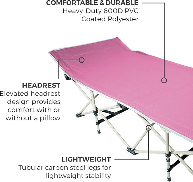 - ULTRA COMFORTABLE - The open sleeping cot dimensions are 28 inches wide, 75 inches long, and 18.5 inches high so you can sleep comfortably on your side or back; an elevated headrest ensures comfort with or without a pillow.