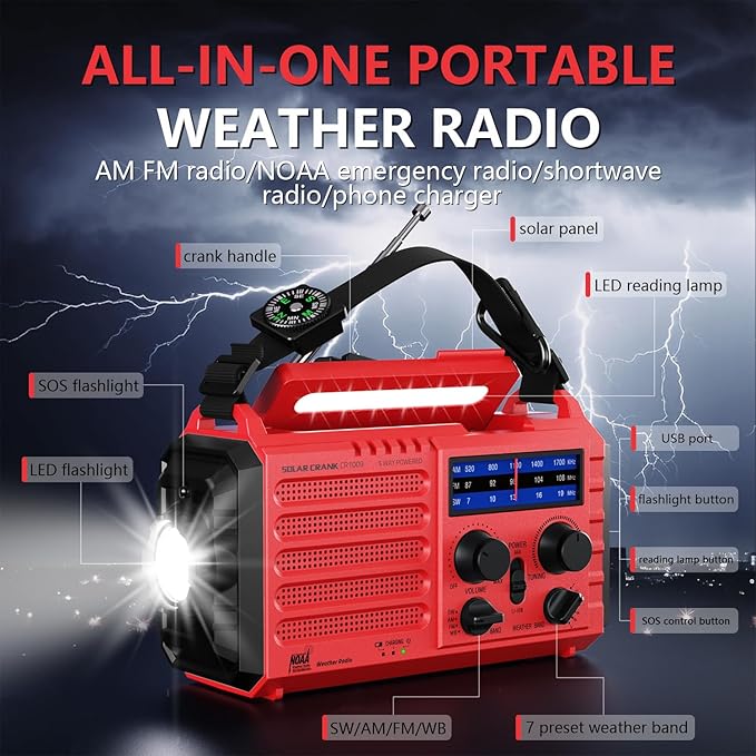 - 【Emergency Survival Kit】Hurricanes, tornadoes, rainstorms, snowstorms, tornadoes, and more,this 𝗲𝗺𝗲𝗿𝗴𝗲𝗻𝗰𝘆 𝗿𝗮𝗱𝗶𝗼 keep your family safe through natural disasters.Timely reporting various life-threatening severe weather issued by National Weather Service, choose the WB band and one of the 7 bands to find your local weather station. Our weather radio will alert you with a loud SOS alarm and flashing red light, never miss a critical time to get prepared even at night while you are sleeping!