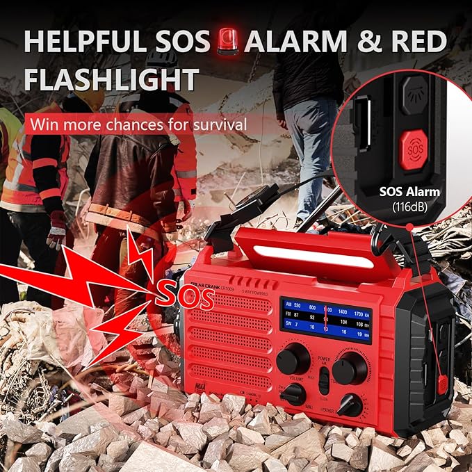 - 【Loud SOS Alarm with Red Light】Our 𝗲𝗺𝗲𝗿𝗴𝗲𝗻𝗰𝘆 𝘄𝗲𝗮𝘁𝗵𝗲𝗿 𝗮𝗹𝗲𝗿𝘁 𝗿𝗮𝗱𝗶𝗼 with versatile functions, a necessary prepper survival tool! When you are in an emergency or need help, you can turn on the flashing red SOS light and alert sound, this emergency radio will alarm loudly, and the red light flash meanwhile, which helps you easily get the attention of others.