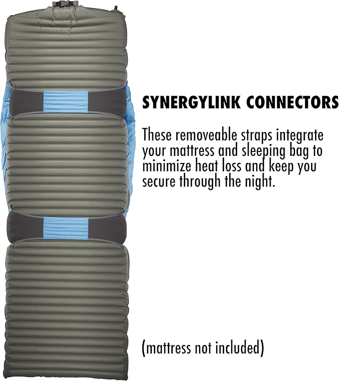 - SynergyLink Connectors integrate the bag with a pad for optimal efficiency and comfort; zoned Insulation maximizes warmth and saves weight