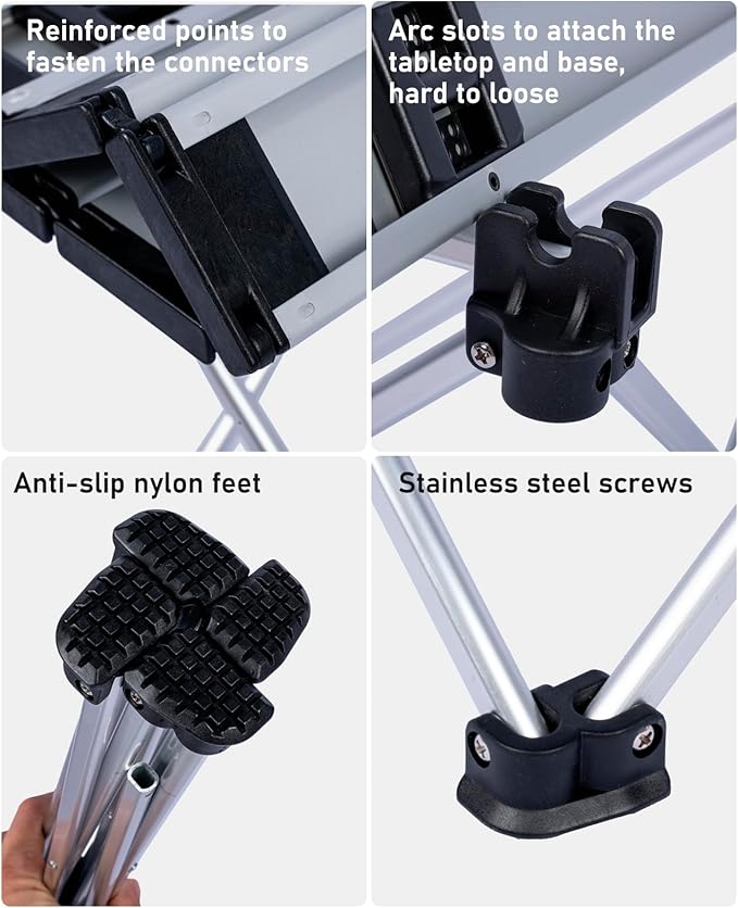 - Ultralight, made of aerospace-grade aluminum alloy, only 2.2 lbs; Max Load 66 lbs; Unlike wooden or nylon-top tables, this table is durable, waterproof, corrosion-resistant, easy to clean; Sturdy joints and connectors, plus anti-slip rubber feet make this table more stable, and the legs won't fold, bend, or disengage on different terrain; Very easy to set up, just open the base frame and attach the table top, enjoy your leisure time in seconds