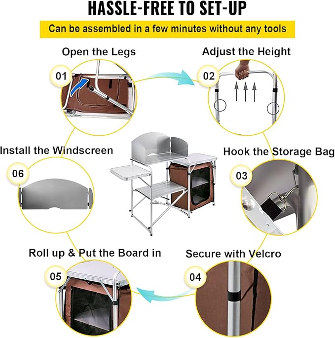 VEVOR Camping Kitchen Table, Aluminum Portable Folding Camp Cook Station with Windscreen, Cupboard, Storage Organizer, Carrying Bag, Quick Installation for Outdoor Picnic Beach BBQ RV Traveling, Brown