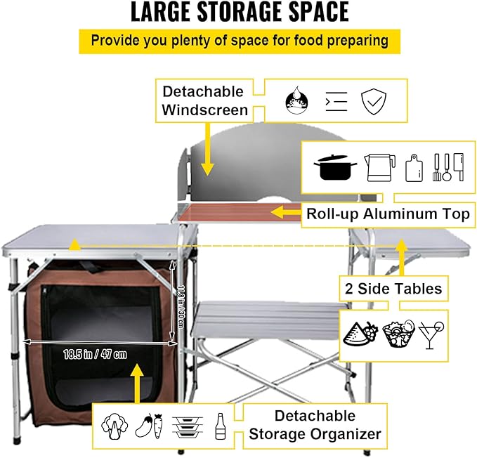 - Spacious Storage Space: The camp kitchen table comes with a roll-up aluminum tabletop, a windshield and 2 side tables, holding your grills, cooking tools, condiments, and other supplies. The 2-tier detachable storage organizer provides you with extensive space to place utensils in order.