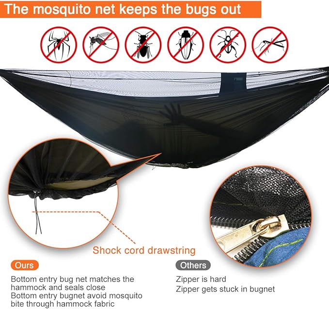- EASY TO SET UP. Our bottom entry bug net can easily be set up by pulling it over the hammock ridgeline and cinching the ends tightly at the ends of the hammock. You can access the hammock through the bottom. When you cinch the shock cord at the bottom of bugnet, the bug net will match the count out of the hammock and seal close. Avoid mosquitos biting through hammock bed fabric.