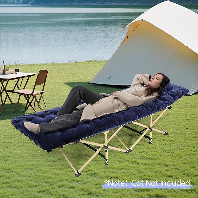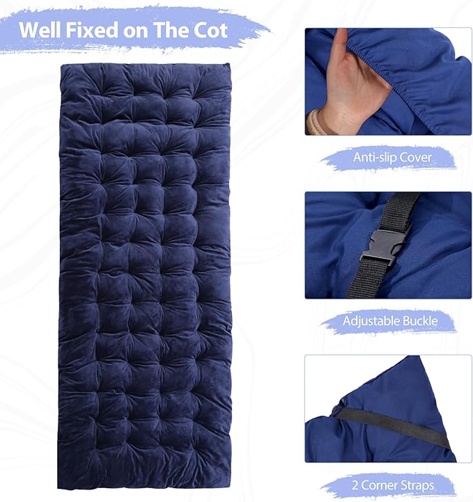 - Perfect Companion with Camping Cot: 2 elastic straps, a wide corner sleeve and bucket on the backside of the pad ensure the camping cot mattress stay put on the cot