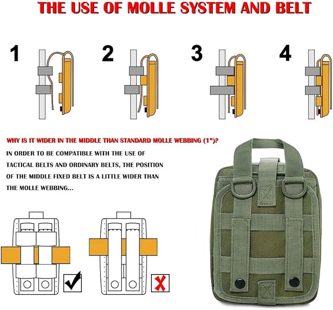 - Tactical first aid bag is military grade Molle compatible tactical medical pouch, compact IFAK Universal Pouch with elastic straps inside.Perfect for carrying medical supplies(Medical supplies do not included!!!.).