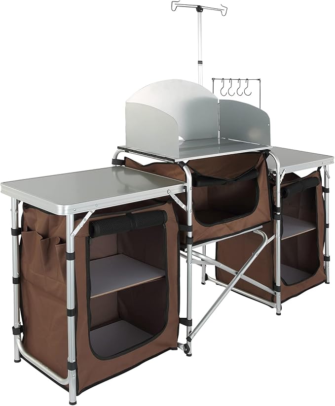 VBENLEM Camping Kitchen Table, Aluminum Portable Folding Camp Cook Table with Windshield, 3 Cupboard, Storage Organizer, Quick Installation for Outdoor Picnic Beach Party Cooking, Brown