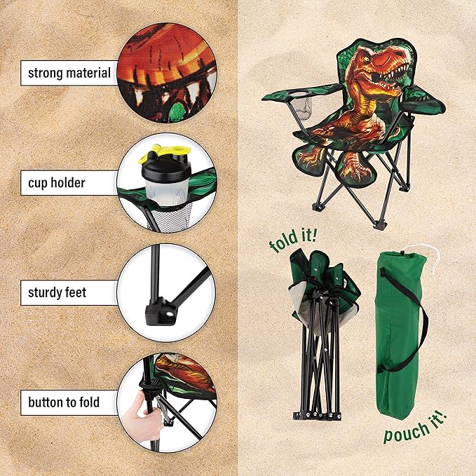 Toy To Enjoy Outdoor Dinosaur Kids Camping Chair – Foldable Children’s Chair for Camping, Tailgates, Beach, – Carrying Bag Included Mesh Cup Holder & Sturdy Construction. Ages 5 to 10 (Patent Pending)