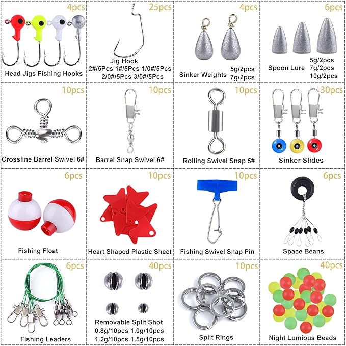 - VARIOUS FISHING ACCESSORIES- TOPFORT 228 pcs fishing tackles set collects nearly all accessories including Off set hooks/barrel swivels / barrel snap swivels/swivel slides/ Three way cross-line barrel swivels / fishing floating bobbers/ split shot weights/fishing beads/ Barrel Swivel with Safety Snap/ Fishing Leaders/ Heart Shaped Plastic Sheet/ Fishing Sinker Weights / Space Beans / suitable for all sorts of fishing conditions (About 0.09USD for each piece)