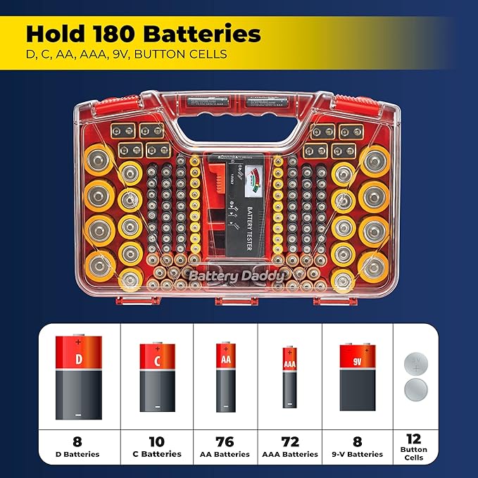 - Sleek and Compact Design: Battery Daddy uses both sides to store up to 180 batteries of all types. Holds 78 AA, 64 AAA, 8 9-Volt, 10 C, 12 Coin Cell, and 8 D batteries. Easily stores away in any drawer. Includes Battery Tester