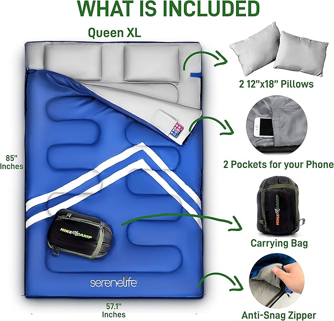 - QUEEN-SIZE COMFORT – Spacious 85" x 57.1" sleeping bag fits two adults comfortably, ideal for couples or solo campers. Includes two travel pillows and pockets for phone or small essentials.