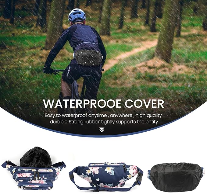• 【6 MULTI-POCKET DESIGN】Our fanny packs for women & men will keep your hands & pockets free! 5 zipper pockets of different sizes and a hidden zipper pocket design, hidden zip perfect give your valuables extra security, all your needs. The largest pocket can easily accommodate a standard water bottle. A zippered exterior pocket located behind the waist band with Rain Cover it can better protect important items in rainy days.