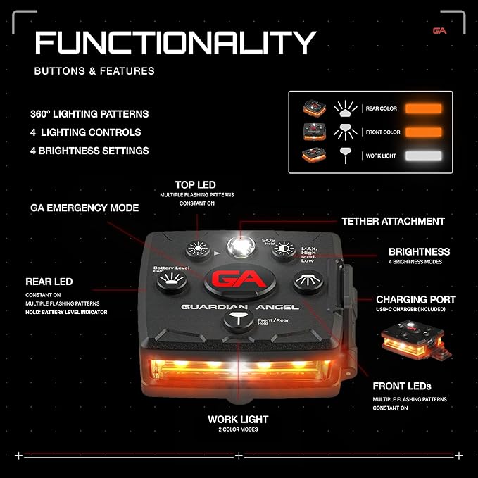 - ๐ ๐ฎ๐ ๐ถ๐บ๐๐บ ๐ฉ๐ถ๐๐ถ๐ฏ๐ถ๐น๐ถ๐๐: With 14 high-output LEDs, the Guardian Angel Micro Series keeps you visible from up to 3+ miles. With 360ยฐ lighting, others can see you from all sides. Four brightness settings, multiple flash patterns, steady burn option and Emergency Mode, ensure others can see you when needed. This device features 6 orange LEDs on the front, 6 orange LEDs on the rear, a single white work light, and a white top light.