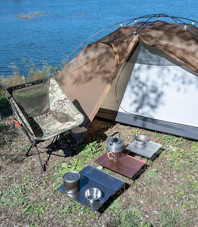 - Flame and heat resistant, separate your stove from the weed; Provide one horizontal platform outdoor, avoid spilling out on uneven ground; Hollow out tabletop, won’t hold boiling water, can be used as coffee and tea table; Low to the ground, more stable than higher tables; Easy to set up, put the backside of the two tabletop plates together, insert the legs into the holes on the plates corner, push the middle of the legs into the slots, to see more details pls check the video in this page