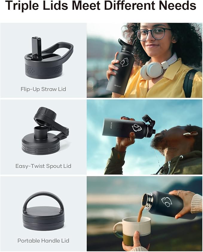 - 3 Caps Pack, 100% Leak-Proof: BUZIO stainless steel water bottle comes with 3 lids: portable handle lid, easy-twist spout lid, and flip-up straw lid to meet camping, hiking, cycling, fitness sports and more. Each lid has a thickened 360° seal for 100% leak-proof.