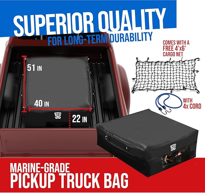 - INCLUDES FREE 4’x 6’ CARGO BUNGEE NET: To provide extra security and peace of mind, each bag comes with a complimentary 4'x6' bungee cargo net that expands up to an impressive 8'x12'. This cargo net not only helps to secure your bag tightly in the truck bed but can also be utilized for a multitude of other purposes.