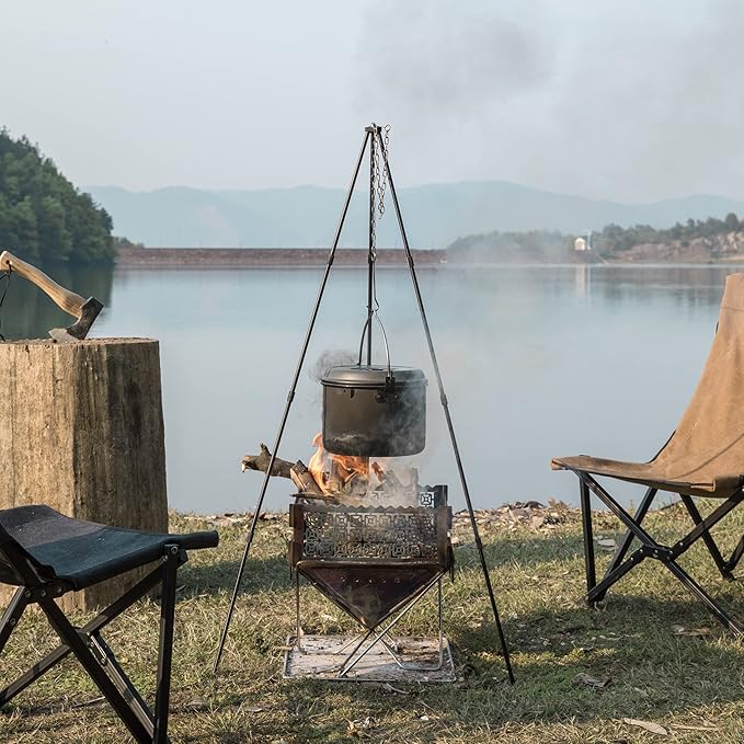 - 【Compact & lightweight】CAMPINGMOON's Campfire Tripod has aluminum frame and stainless steel chain. Weighs just 1.4 pounds, making it easy to carry and set up. It is also designed to be collapsible, so it can be easily packed away when not in use.