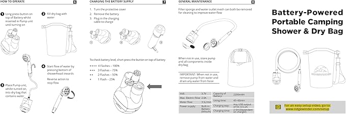 - RECHARGEABLE POWER: Up to 60 minutes of run time on the rechargeable 2200mAH battery ensures there is enough power for the entire family to enjoy their camping trip. Unlike other portable showers with clumsy cables, the battery for our portable outdoor shower simply slides into the pump and is easily removable for when it is time to charge it on any 5V USB power output.